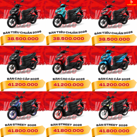 - Vario 2026 giá bao nhiêu tiền tại Việt Nam? Giá dự kiến: CBS 38.5 triệu, CBS-ISS 41.2 triệu, Street 41.8 triệu VND (tháng 1/2026 tại Hệ thống Xe máy Thành Đạt).